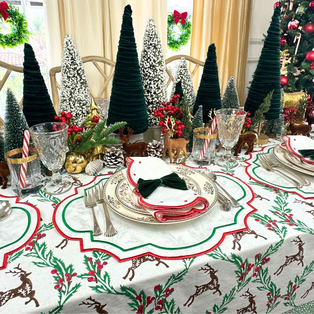 Christmas-themed table setting with decorative placemats, plates, and napkins, linen placemat, luxury Christmas Placemat