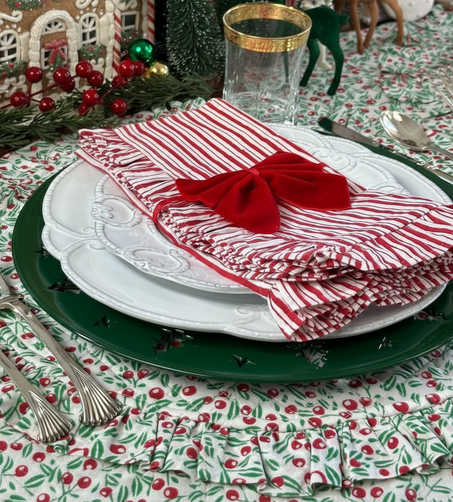 Bring warmth and joy to your holiday table with our enchanting Mistletoe and Bows Quilted Ruffle Placemats.