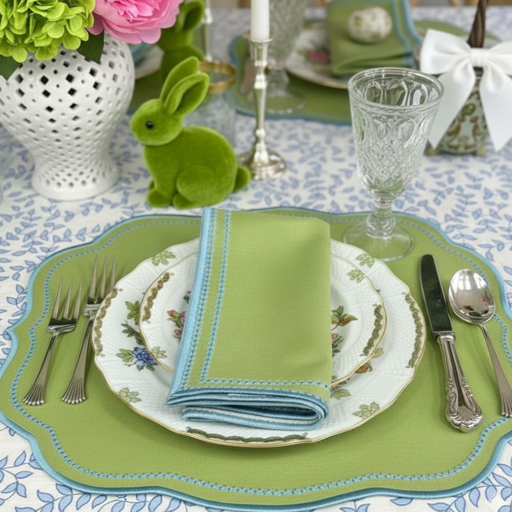 luxury Green napkin with blue embroidery trim and Green placemat with scalloped edge with blue embroidery trim