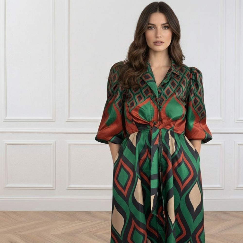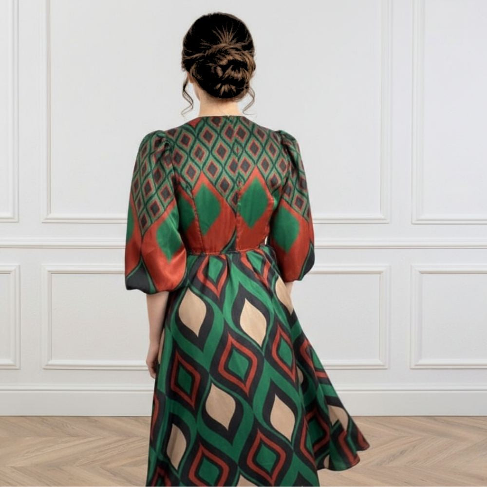 Dress to impress! Sophisticated and fun, this elegant Samuel Dong dress features a rich dupioni fabric that is water-resistant and holds its shape. We love the triple-wired collar that allows you to wear it in multiple ways. The tie in front can be worn in a bow, knot or cross-tied as a belt in the back. Slimming, flattering fit (see size chart in pictures).