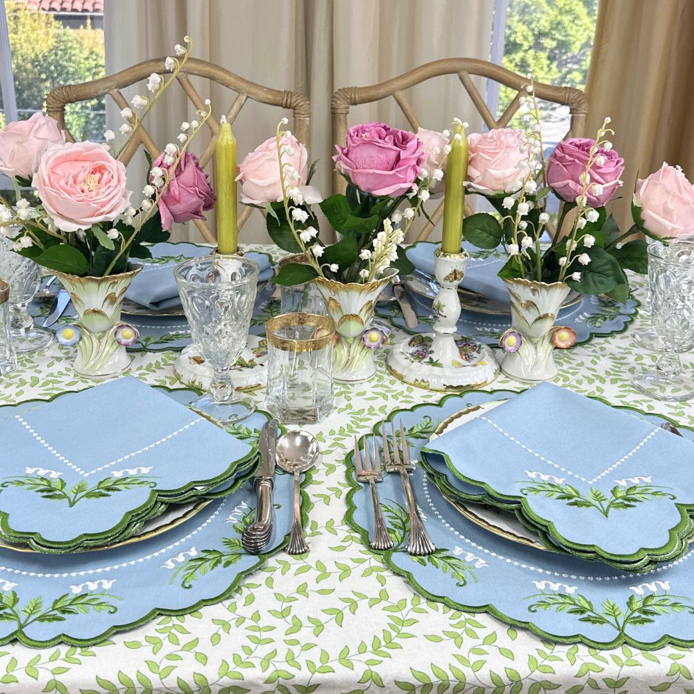 table setting with floral centerpieces, plates, and cutlery on a patterned tablecloth. Luxury Lilly of the valley embroidered placemats and napkins