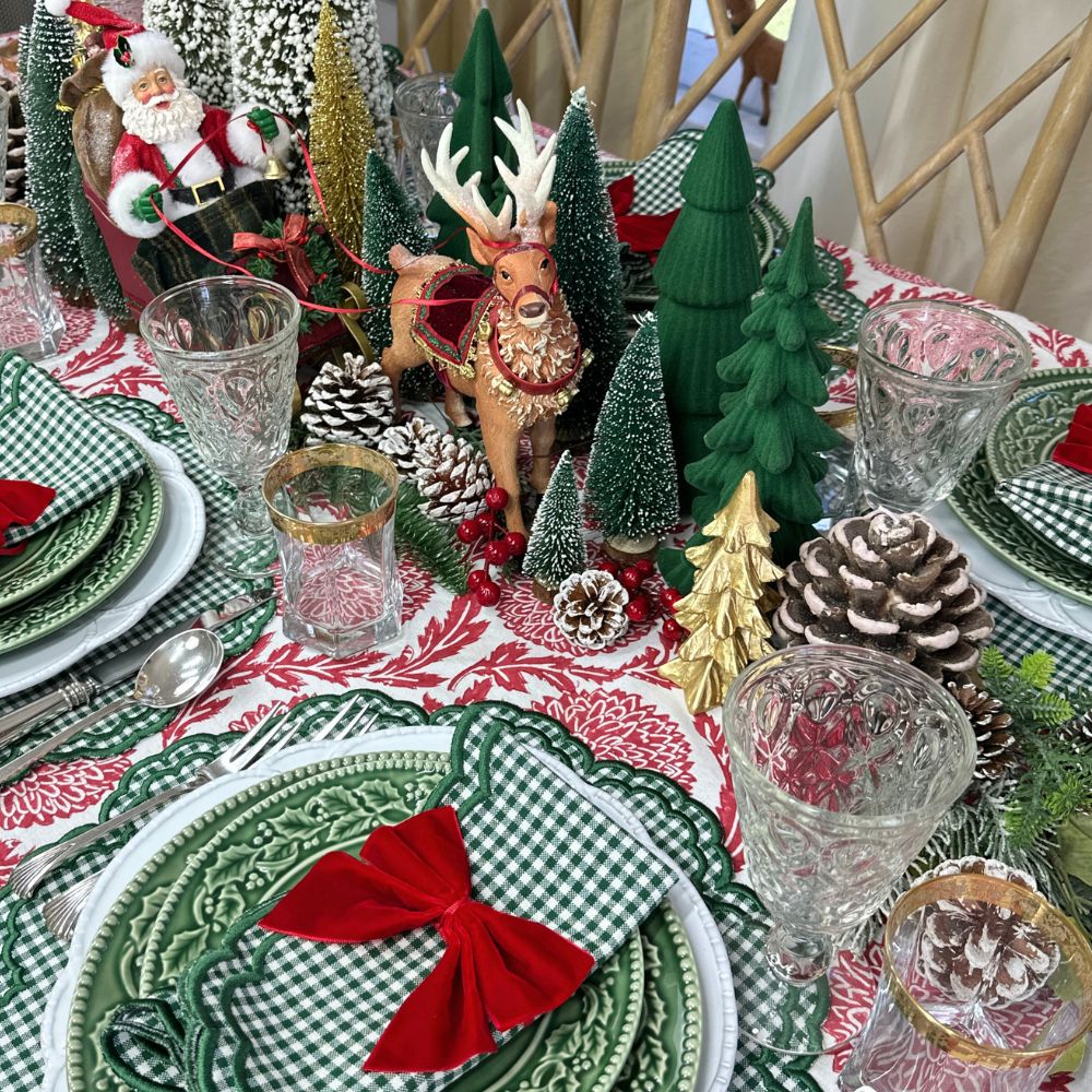 red flower and vine tablecloth and green gingham placemats, red velvet bows, Christmas table