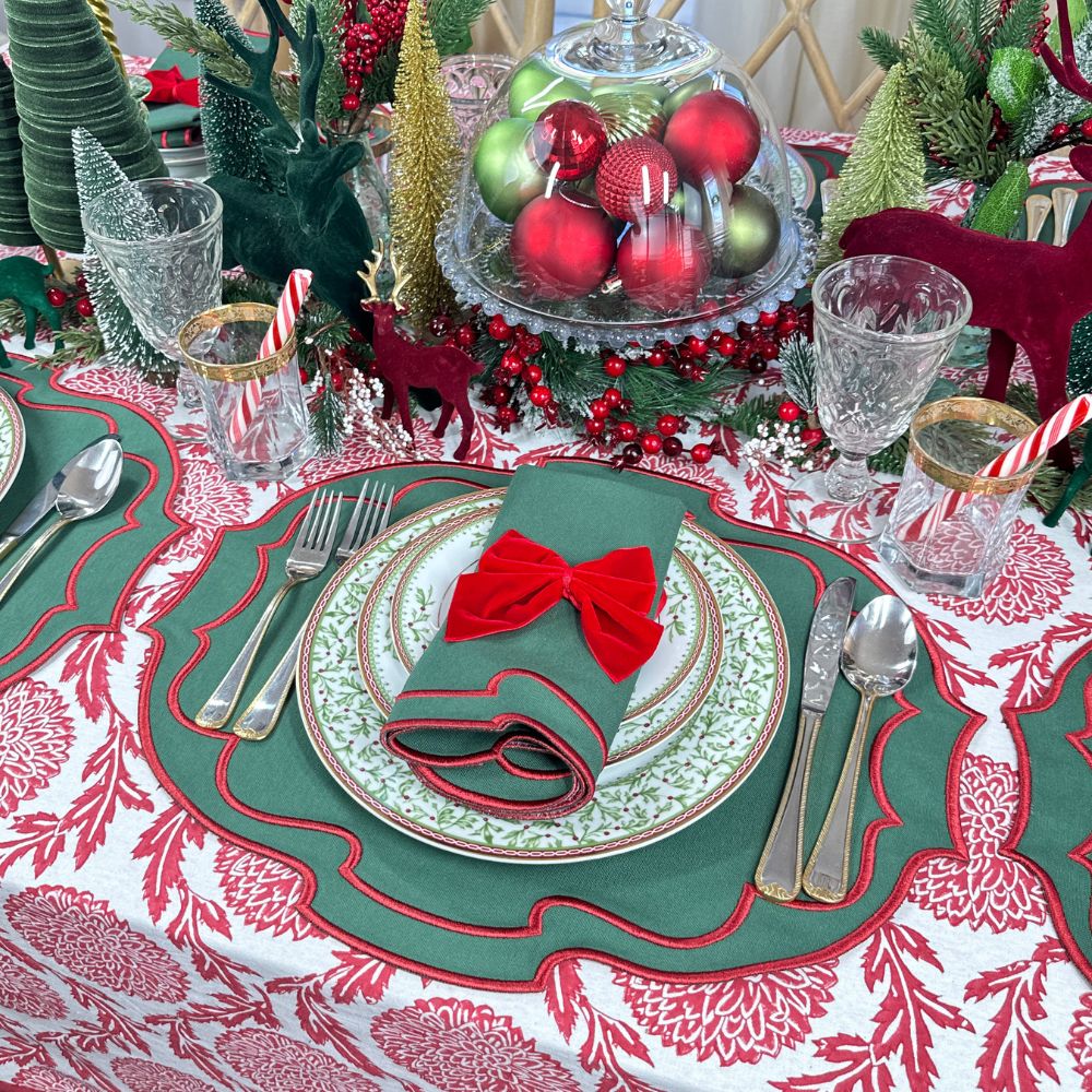 red flower and vine table cloth and green belle luxury placemats red velvet bows, Christmas tablescape