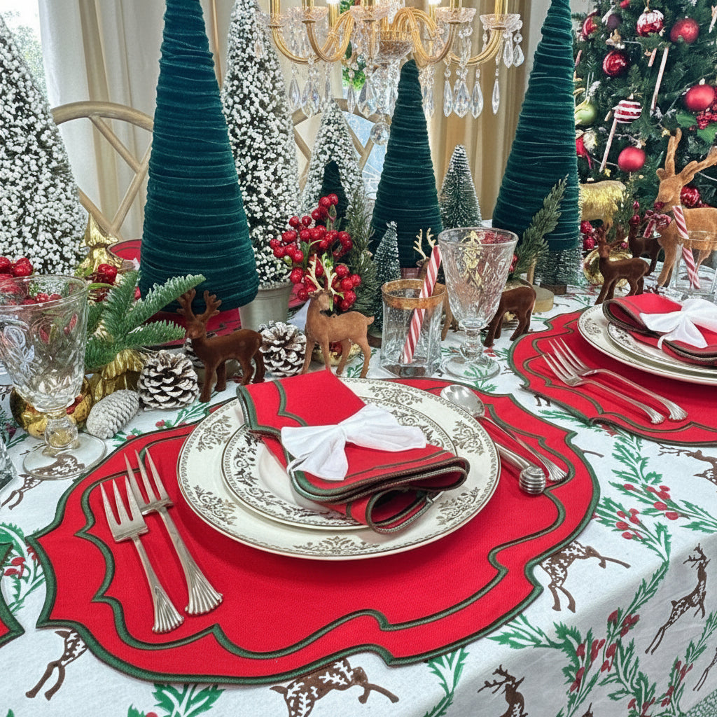 Decorative Christmas table setting with red placemats, white plates, and festive decorations, red and green placemats, red and green napkins, Christmas placemats, Christmas napkins