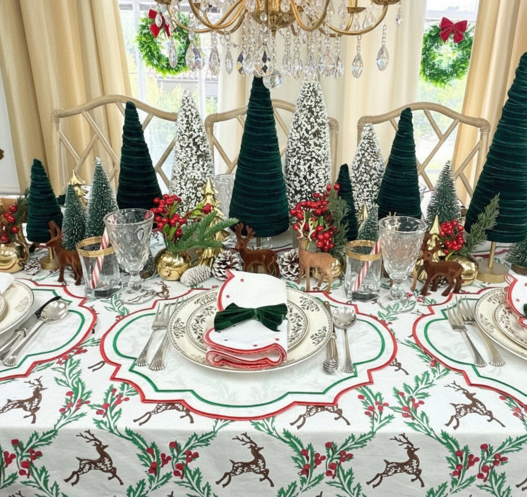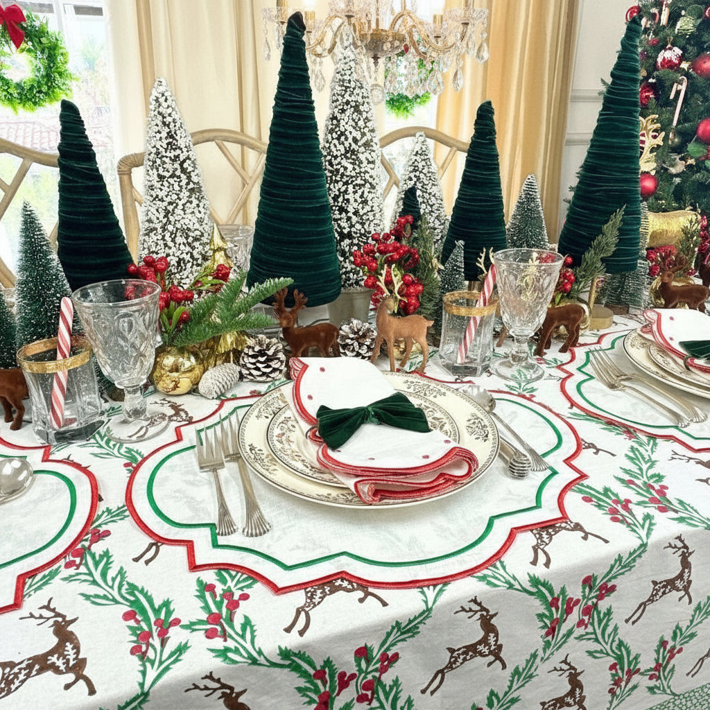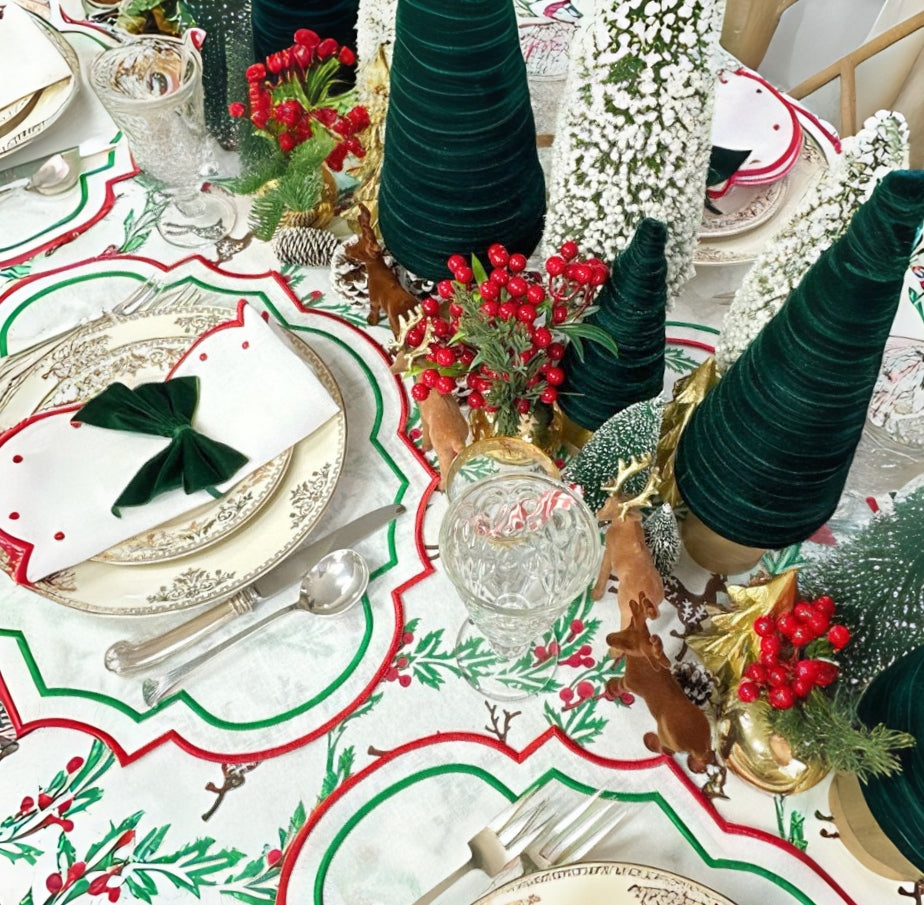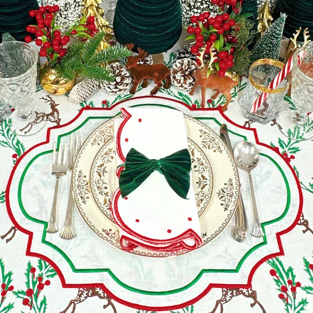 Elevate your holiday dining experience with our premium linen, Studio Collection: Christmas Parker Placemats. Adorned with exquisite embroidery, the sophisticated shape and unique design of the placemats create an aura of elegance.
