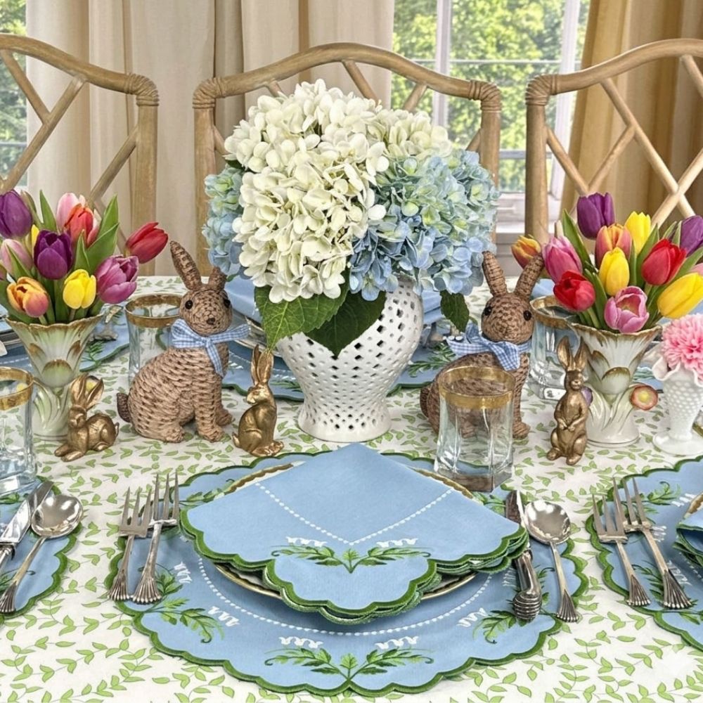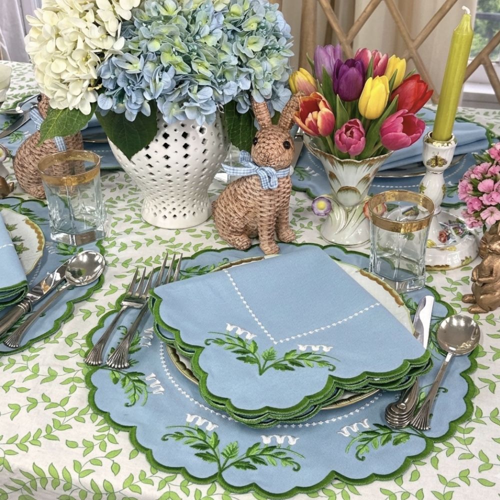 Easter-themed table setting with bunny figurines, floral arrangements, and decorative plates, Lily of the Valley placemats.